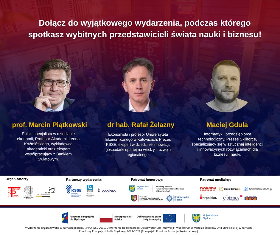 17:30 – 18:30 – Panel dyskusyjny „Przemysł, instytucje, inwestycje – filary polskiego rozwoju po 2025 roku” – Prof. Marcin Piątkowski; dr hab. Rafał Żelazny, Prof. UE – Prezes Zarządu KSSE S.A., moderator Jacek Kotra – Dyrektor „Technoparku Gliwice”.