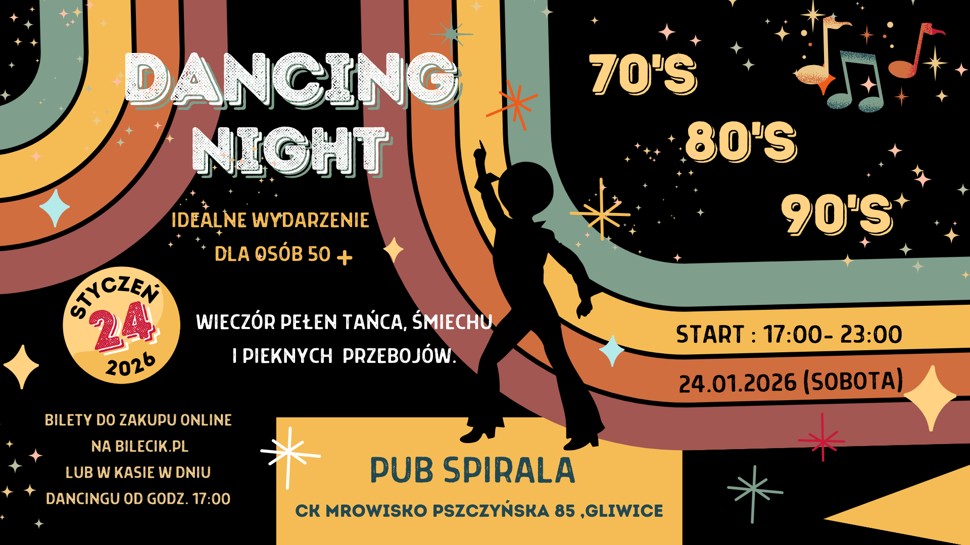 ✨ DANCING NIGHT – WYJĄTKOWY WIECZÓR DLA OSÓB 50+ ✨ 24 stycznia 2026 (sobota) | 17:00–23:00 Pub Spirala – CK Mrowisko, Pszczyńska 85, Gliwice Zapraszamy na niezwykły wieczór pełen tańca, uśmiechu i najpiękniejszych przebojów z lat 70’s, 80’s i 90’s! To idealna okazja, aby spędzić czas w świetnej atmosferze, rozruszać biodra na parkiecie i przypomnieć sobie największe taneczne hity minionych dekad. Czeka na Was: ⭐ Stylowy dancing dla osób 50+ ⭐ Klimatyczna muzyka, która porwie do tańca ⭐ Niezapomniany wieczór w gronie fantastycznych ludzi ⭐ Swobodna, przyjazna atmosfera i mnóstwo dobrej energii. Bilety: 25 zł Bilety dostępne online: https://kbq.pl/187823. W dniu wydarzenia bilety kupisz także w kasie od godz. 17:00 Niech to będzie Wasza wyjątkowa, styczniowa noc pełna wspomnień i tanecznej radości! Zarezerwuj czas i dołącz do nas — parkiet czeka! ✨