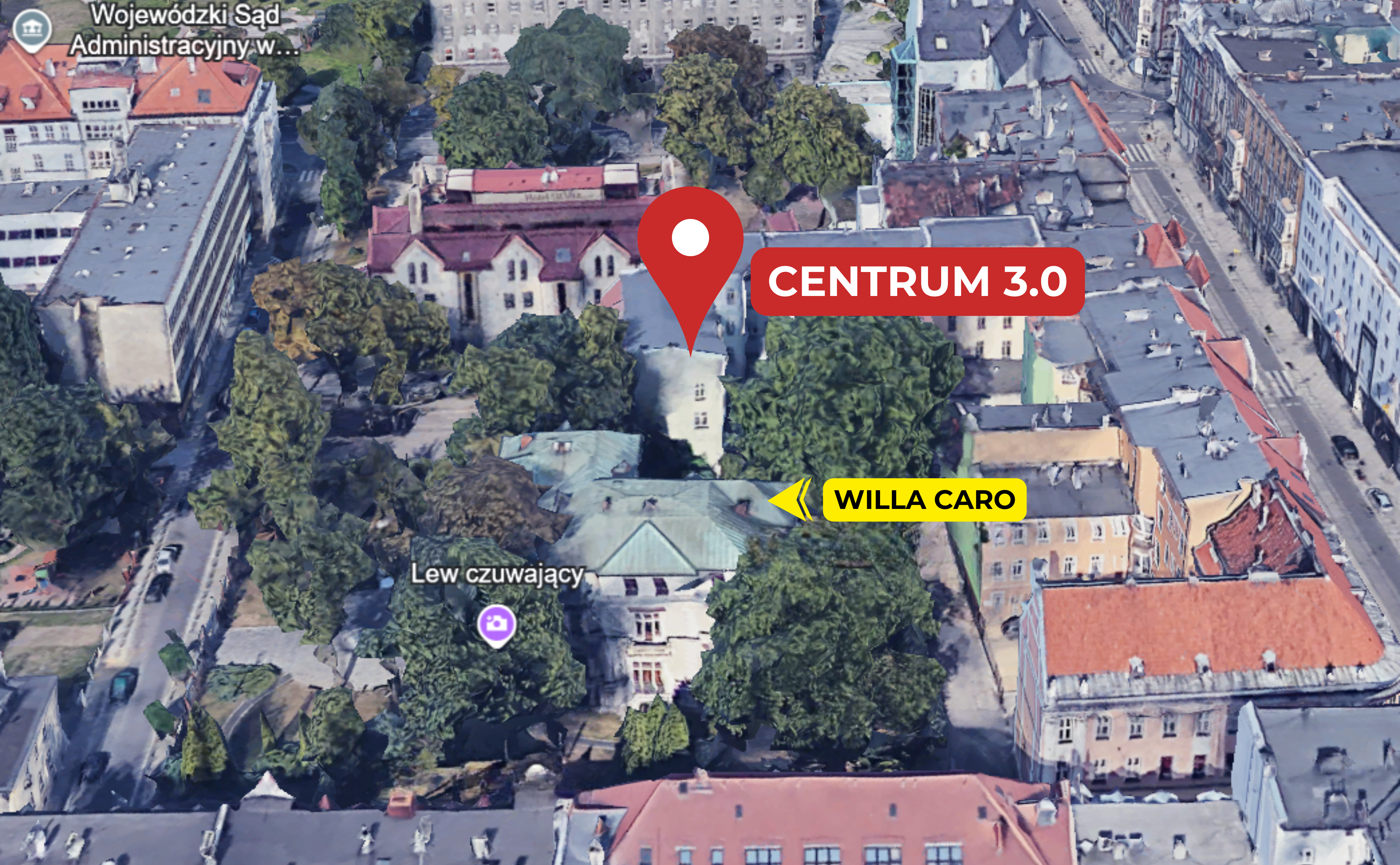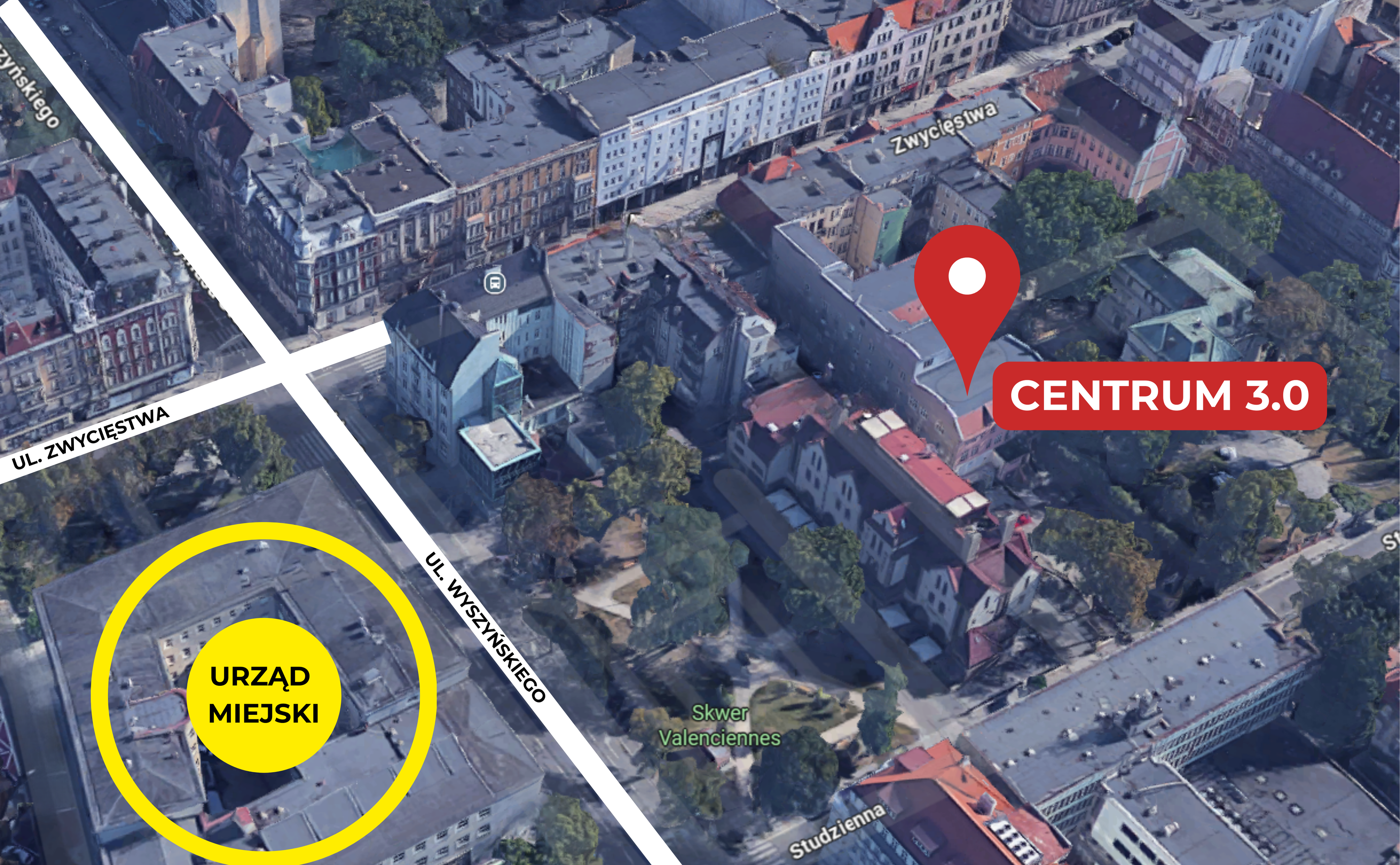 wewnątrz budynku – od wejścia głównego po prawej stronie, przymocowany na ścianie