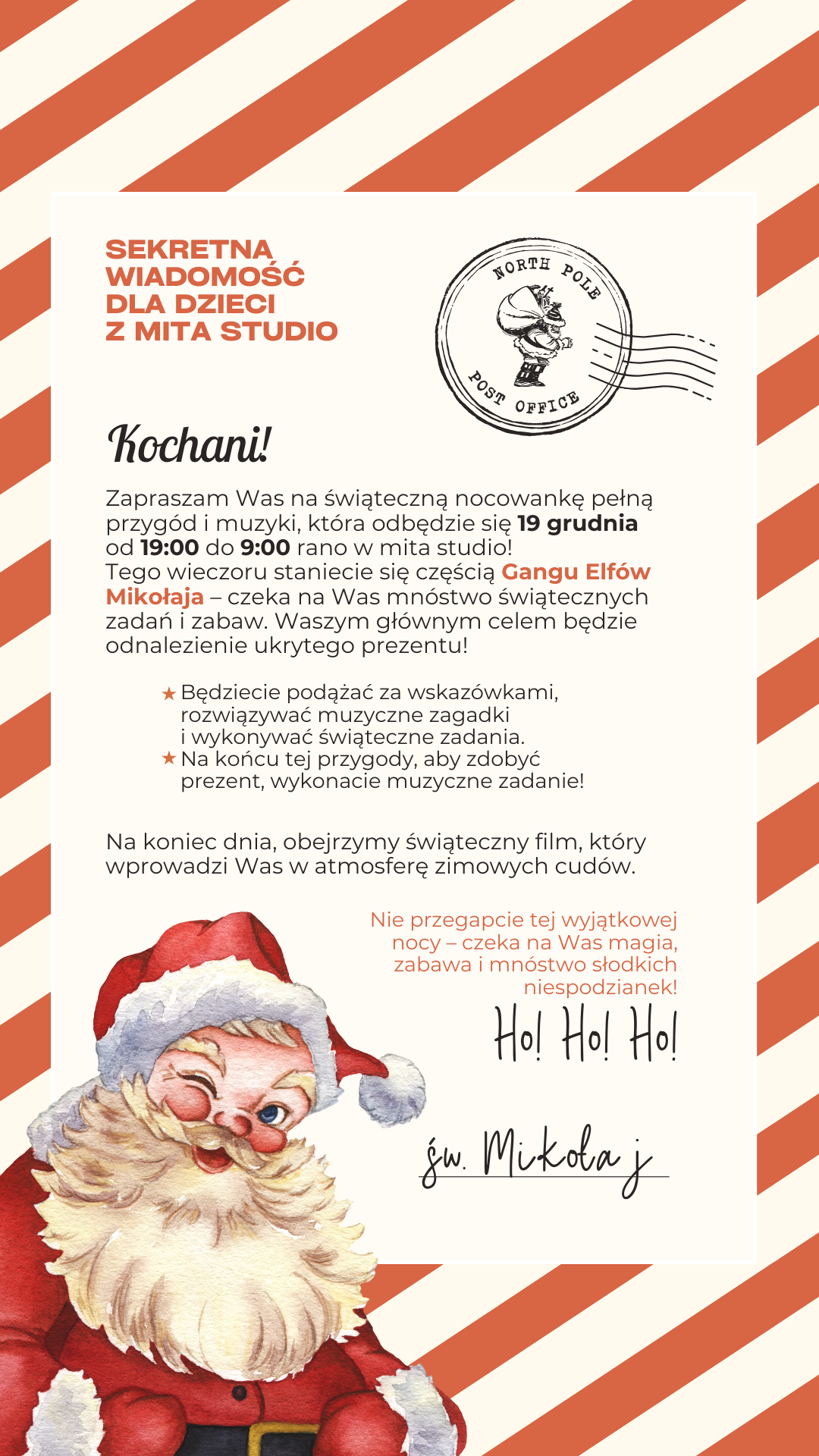 nocowanka w mita studio! zapraszamy do Gangu Elfów Mikołaja! 19 grudnia od 19:00 - 20 grudnia do 9:00 W programie: zabawy muzyczne i ruchowe, nauka świątecznej piosenki, poszukiwanie skarbów, potańcówka u Świętego Mikołaja oraz świąteczny film. Kolację zapewniamy my. To będzie noc pełna świątecznej magii i wrażeń – dzieci na pewno wrócą szczęśliwe, a Wy drodzy rodzice złapiecie chwile dla siebie przed świętami! adres: ul. Chopina 10, Gliwice koszt: 100zł zapisy: mita.biuro@gmail.com