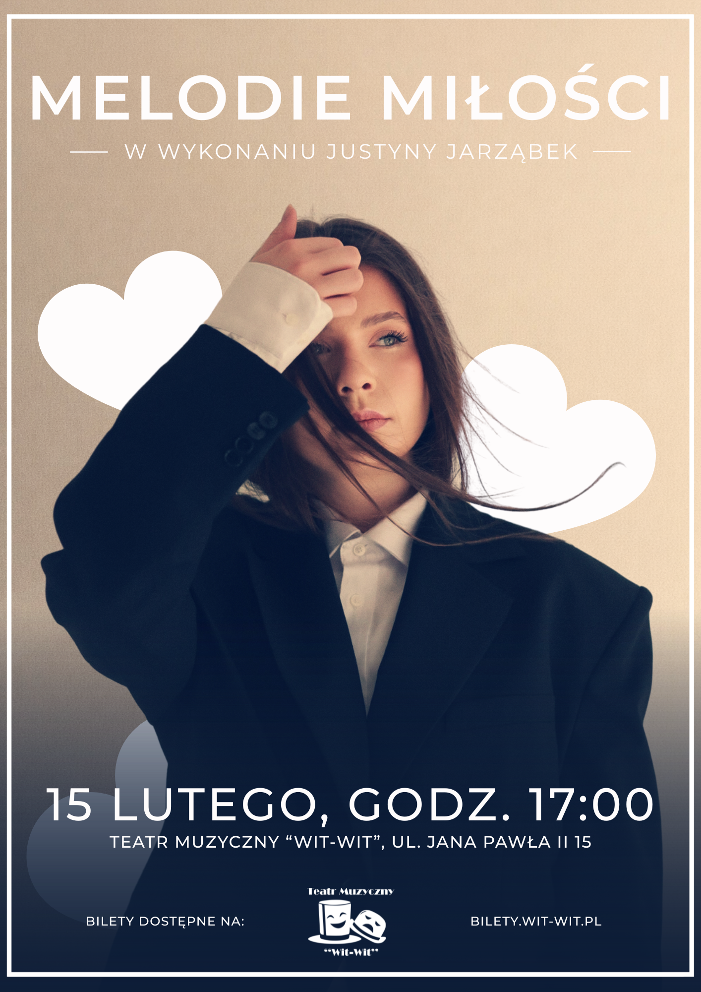 „Melodie Miłości” to wyjątkowy koncert walentynkowy pełen najpiękniejszych utworów o miłości - tej szczęśliwej, tęskniącej, wzruszającej i prawdziwej. To wieczór, który pozwala zatrzymać się na chwilę i zanurzyć w emocjach, jakie niesie ze sobą muzyka. Na scenie wystąpi Justyna Jarząbek - wokalistka i muzyk sesyjny, absolwentka kierunku Jazz i Muzyka Rozrywkowa Akademii Muzycznej im. Karola Szymanowskiego w Katowicach. Laureatka konkursów, znana również szerszej publiczności z programu The Voice of Poland. Artystka koncertowała także na dużych scenach, m.in. w Atlas Arenie w Łodzi.