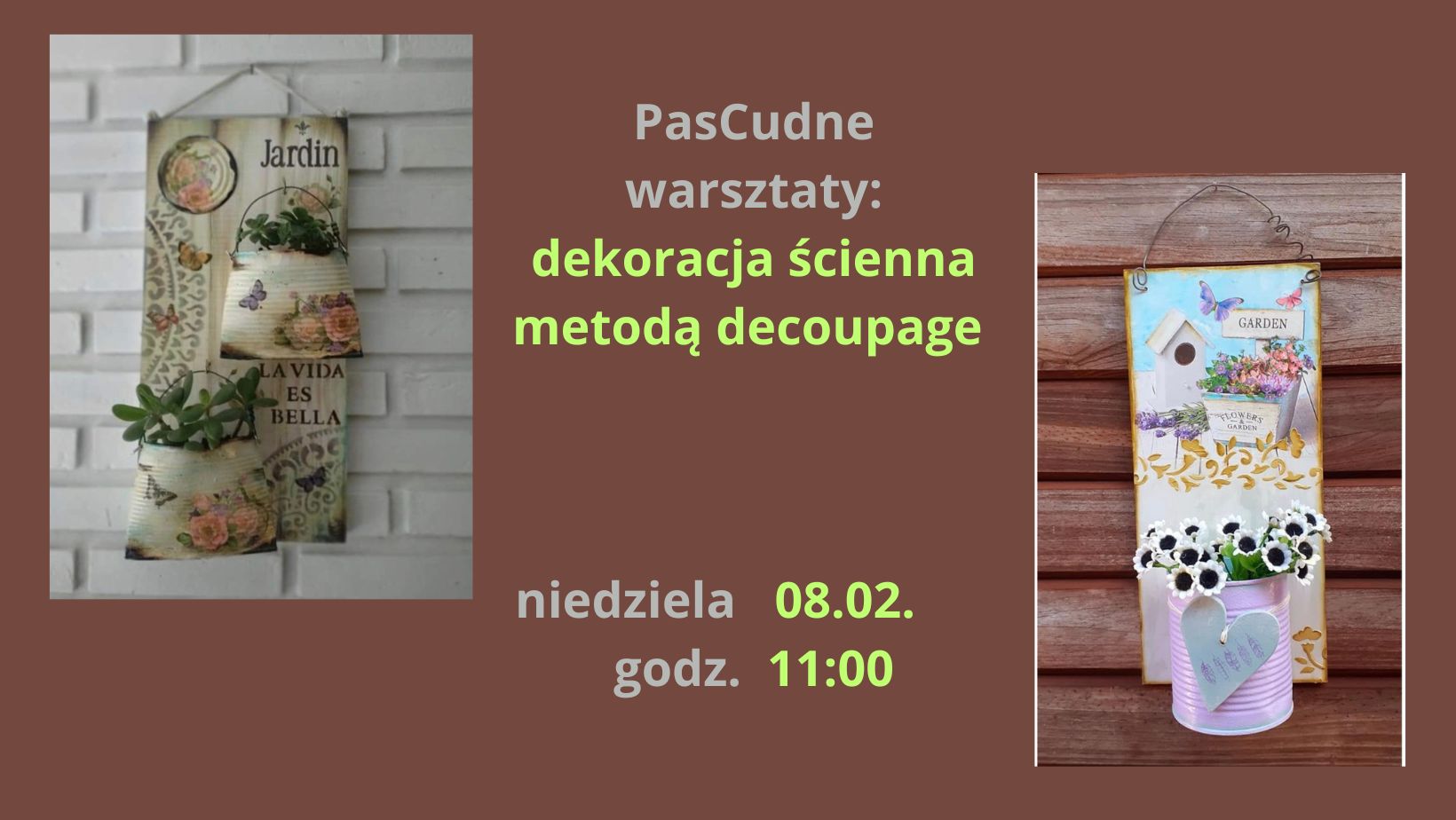 Stwórz swoją piękną dekorację ścienną metodą decoupage ! Wystarczy deska z drewna , farby , serwetki i trochę wyobraźni. Doczepiona metalowa puszka lub szklany słoik do deski będzie spełniać funkcjonalną ozdobę. Może to być miejsce na kaktusa albo świecznik- o tym ty już sam /sama zadecydujesz. Nauczymy Ciebie techniki decoupage, dzięki której ozdobisz drewno i słoik. Mało tego! Do dyspozycji na naszym warsztacie będą wkrętarki, młotki, gwoździe itp., więc możesz przy okazji nauczyć się umiejętności, które z pewnością przydadzą się w przyszłości. Kiedy: niedziela 08.02. godz. 11:00-13:00 Grupa: grupa 3 -11 osób Gdzie: PaskudoFonia Gliwice, ul. Bednarska 8 (w podwórku) Cena: 70 zł obejmuje wszystkie niezbędne materiały i drobny poczęstunek Zapisy online lub w Sklepiku z rękodziełem PasCuda Gliwice, Bednarska 8 (w podwórku)
