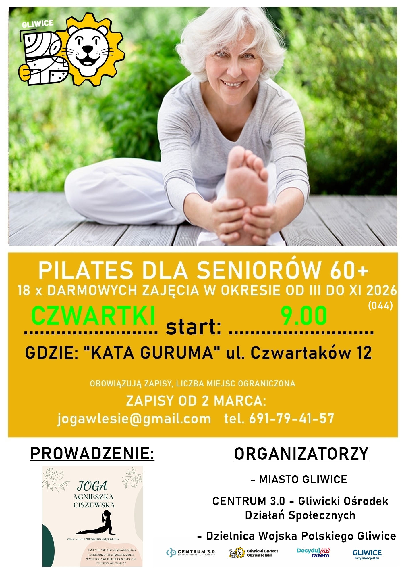 Zapraszamy seniorów (60+) z dzielnicy Wojska Polskiego w Gliwice na cykl bezpłatnych zajęć pilatesu. To świetna okazja, aby poprawić kondycję, wzmocnić mięśnie, zadbać o kręgosłup oraz spędzić czas aktywnie w miłej atmosferze.
